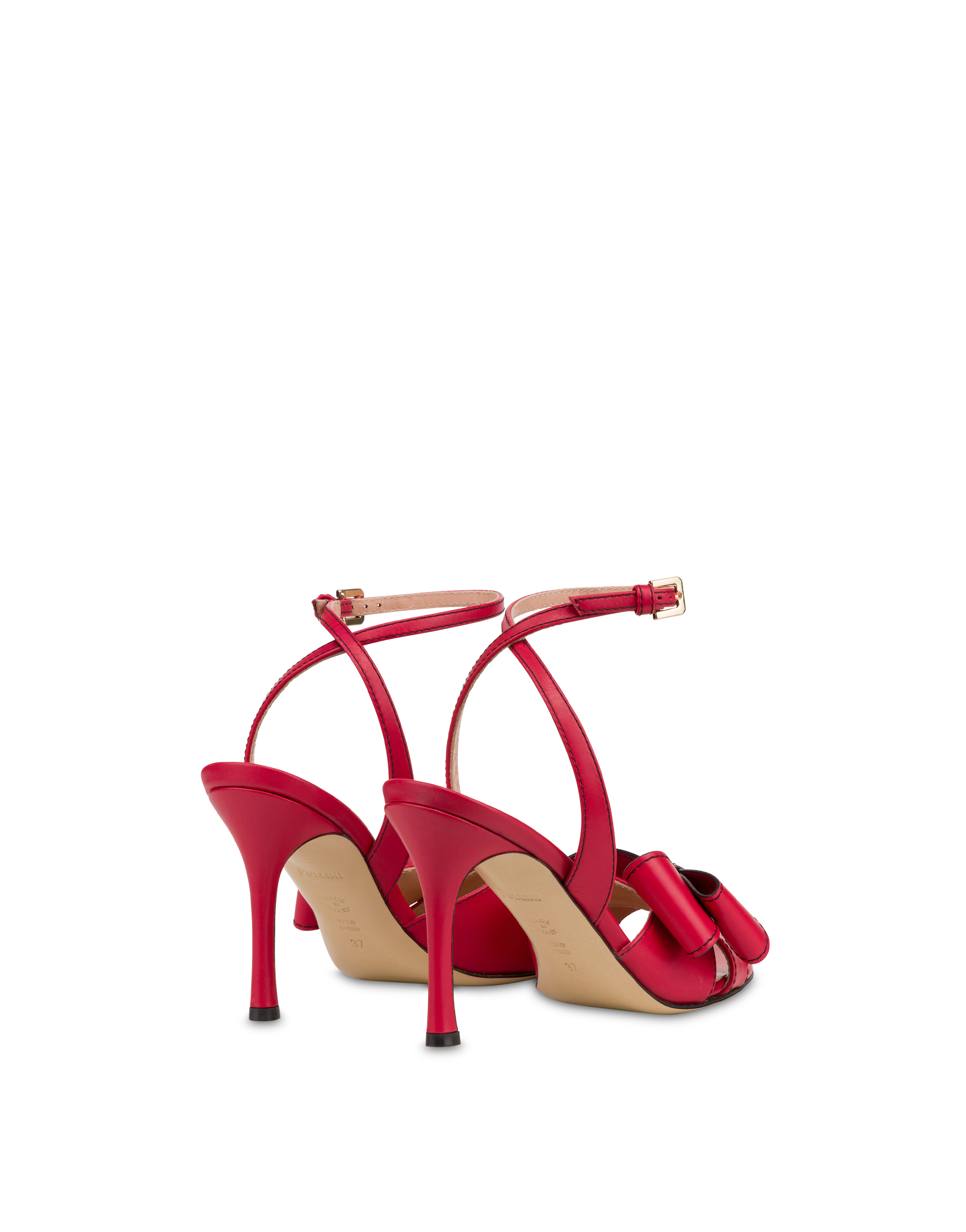 Eine handgefertigte Schleife mit geschwungenen Linien verleiht dieser Sandale einen schicken, originellen Charme. Die kontrastierenden Nähte unterstreichen die handwerkliche Verarbeitung, während der dünne Absatz und der verstellbare Riemen mit kleiner Schnalle den Schuh mit einem Hauch von eleganter Raffinesse vervollständigen.