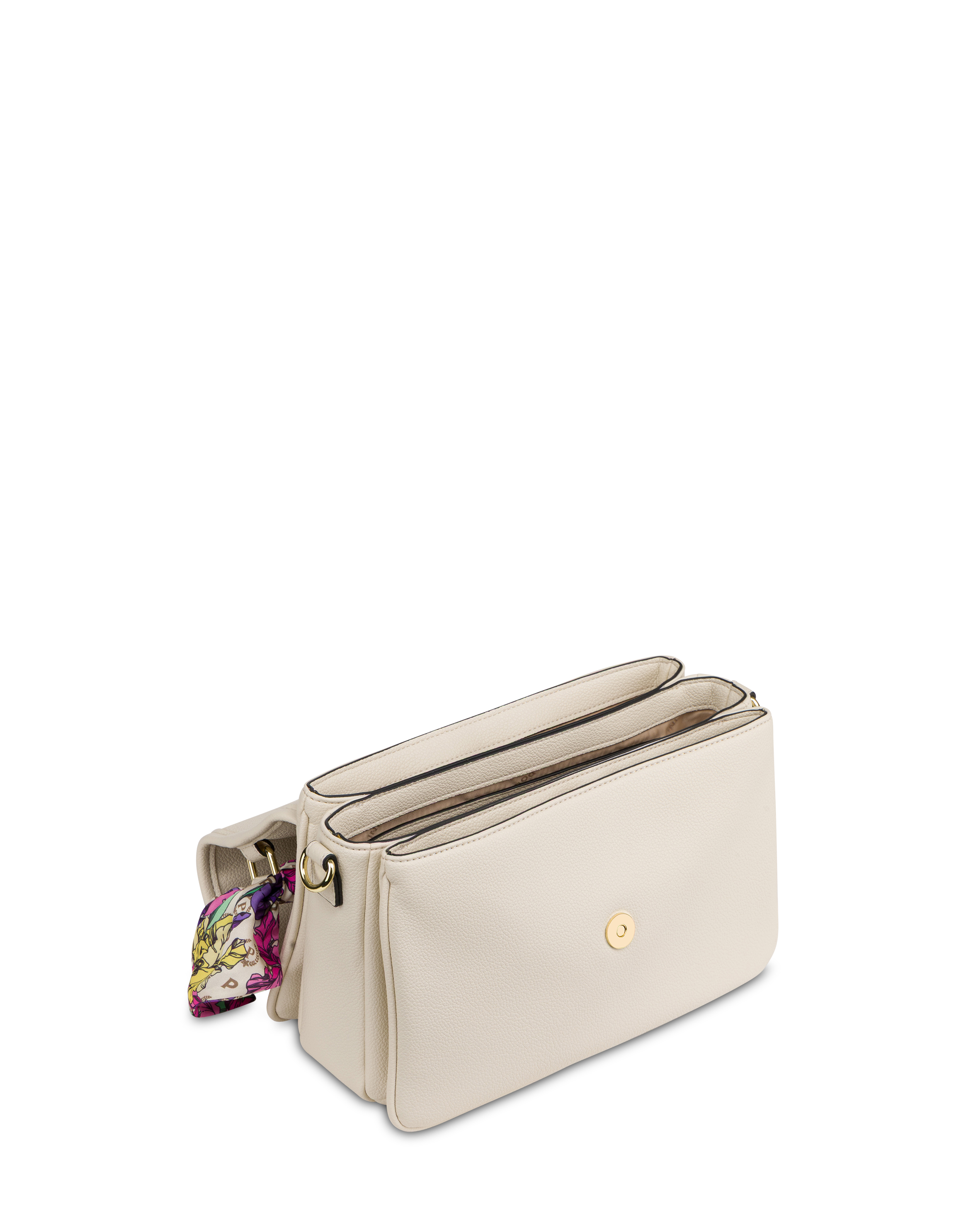 Handle Bag im Postboten-Stil, definiert durch kompakte Volumen und eine zweifache Tragemöglichkeit dank des Griffs und des verstellbaren Schulterriemens. Sie ist funktional und vielseitig und wurde als eleganter Alltagsbegleiter entwickelt. Die mit einem Tuch mit floralem Muster versehenen Griffe, die farblich abgestimmte Logo-Plakette und das dekorative Accessoire sorgen für einen frischen, raffinierten Akzent. Die Struktur aus zwei Materialien kombiniert das geprägte Heritage-Muster mit dem weichen feingenarbten Material, Ausdruck raffinierter Handwerkskunst und Pollini-Identität.