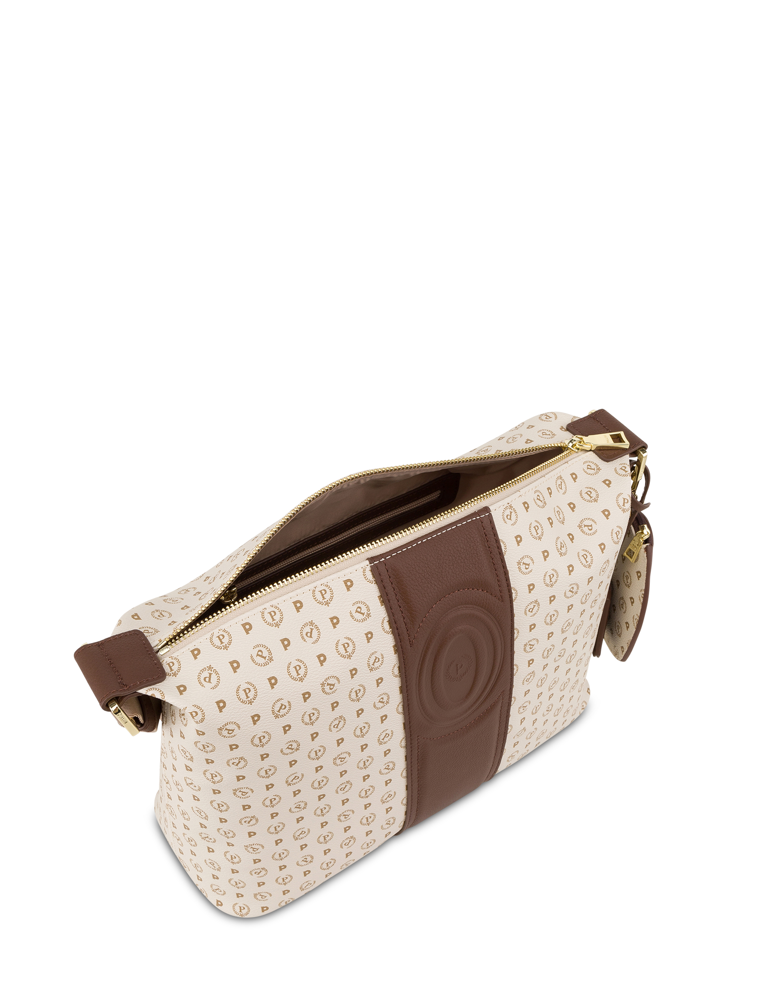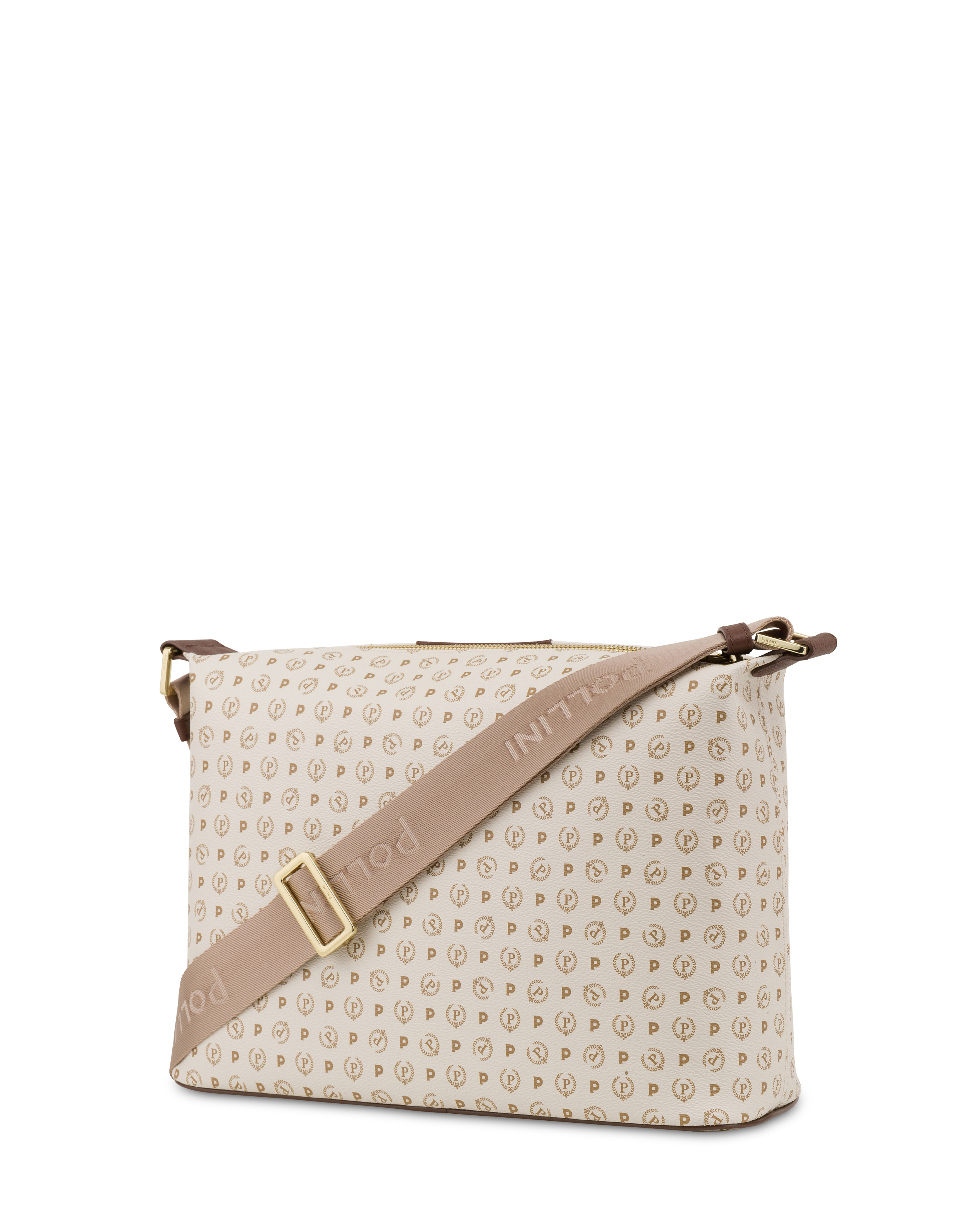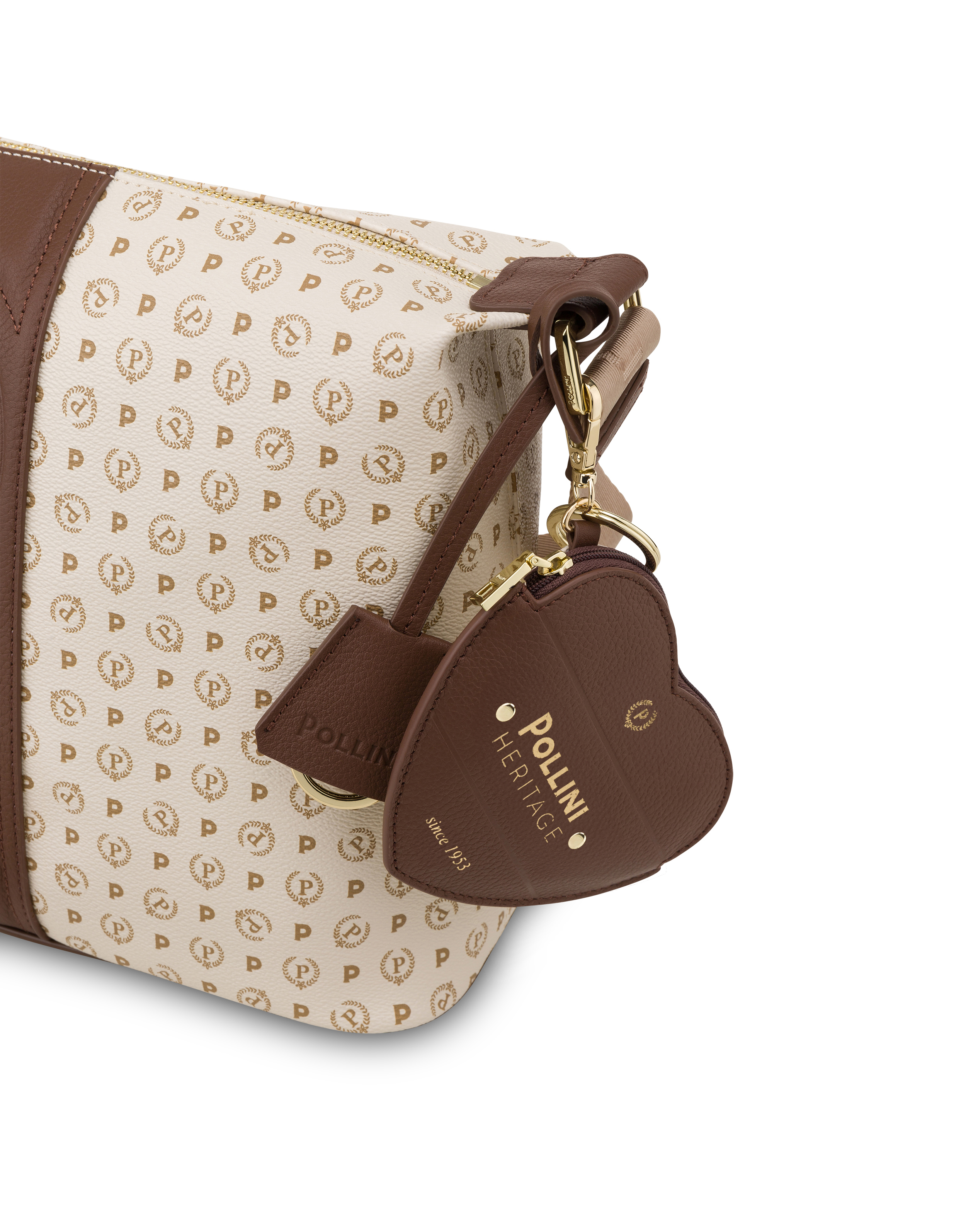Umhängetasche aus der exklusiven Capsule-Kollektion Heritage. Das ikonische Pollini-Logo wird anlässlich des 70-jährigen Bestehens überarbeitet. Das klassische P-Lorbeer-Logo ist auf einem Lederband eingebrannt und erzeugt einen raffinierten dreidimensionalen Effekt. Herzförmiger Portemonnaie-Charm. Schultergurt aus Nylon-Jacquard mit Logo für doppelte Tragbarkeit: an der Schulter und am Handgelenk.