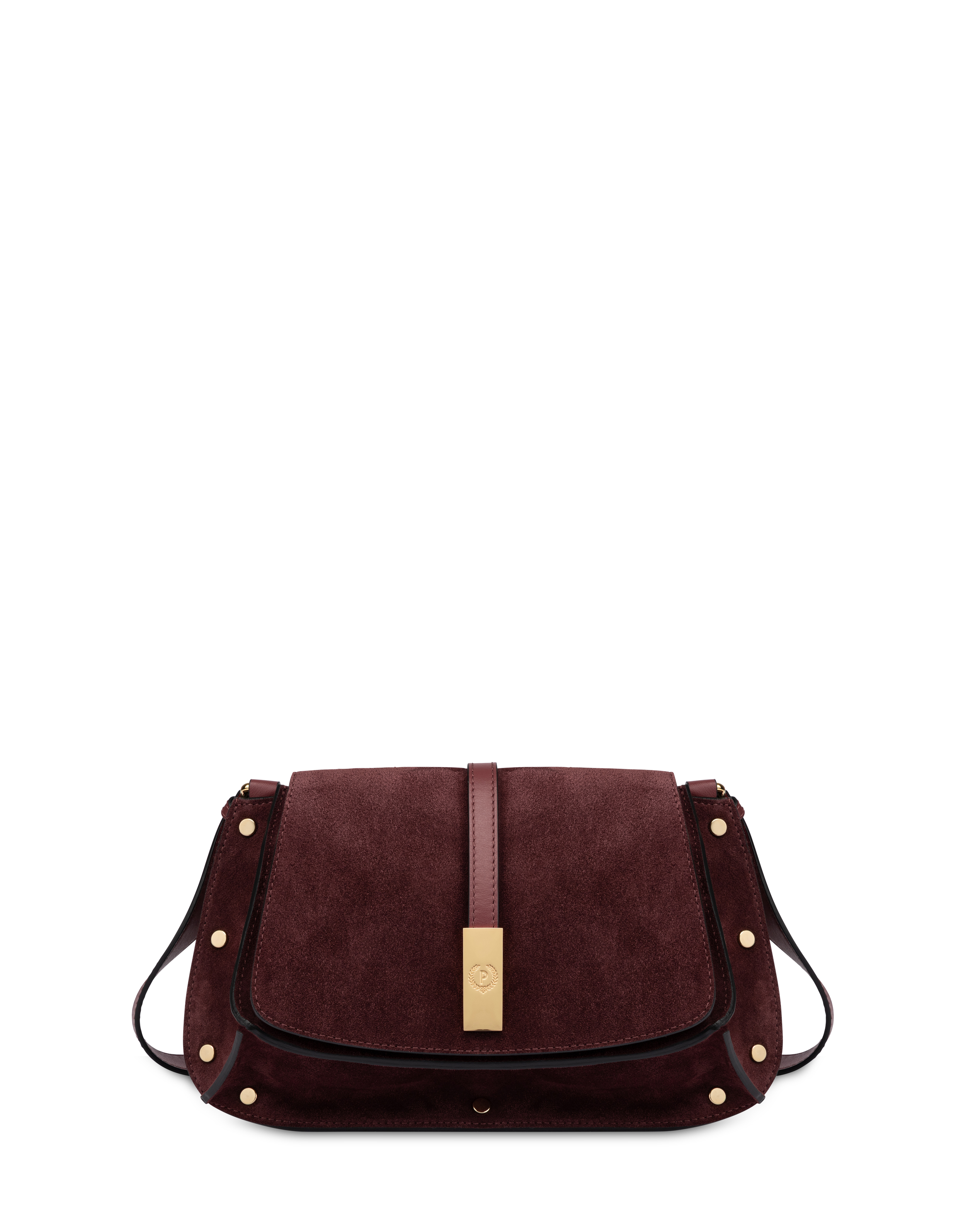 Compact and distinctive, the Austin Crossbody in split leather combines bold lines with impactful details. The adjustable shoulder strap with a metal buckle provides convenient over-the-shoulder portability while the magnetic closure guards a lined interior with an open pocket and a leather logo label. The decorative studs and metal plate with engraved 'P' Laurel logo add character and an unmistakable distinctiveness, complemented by gold-plated finishes for a touch of contemporary shimmer.