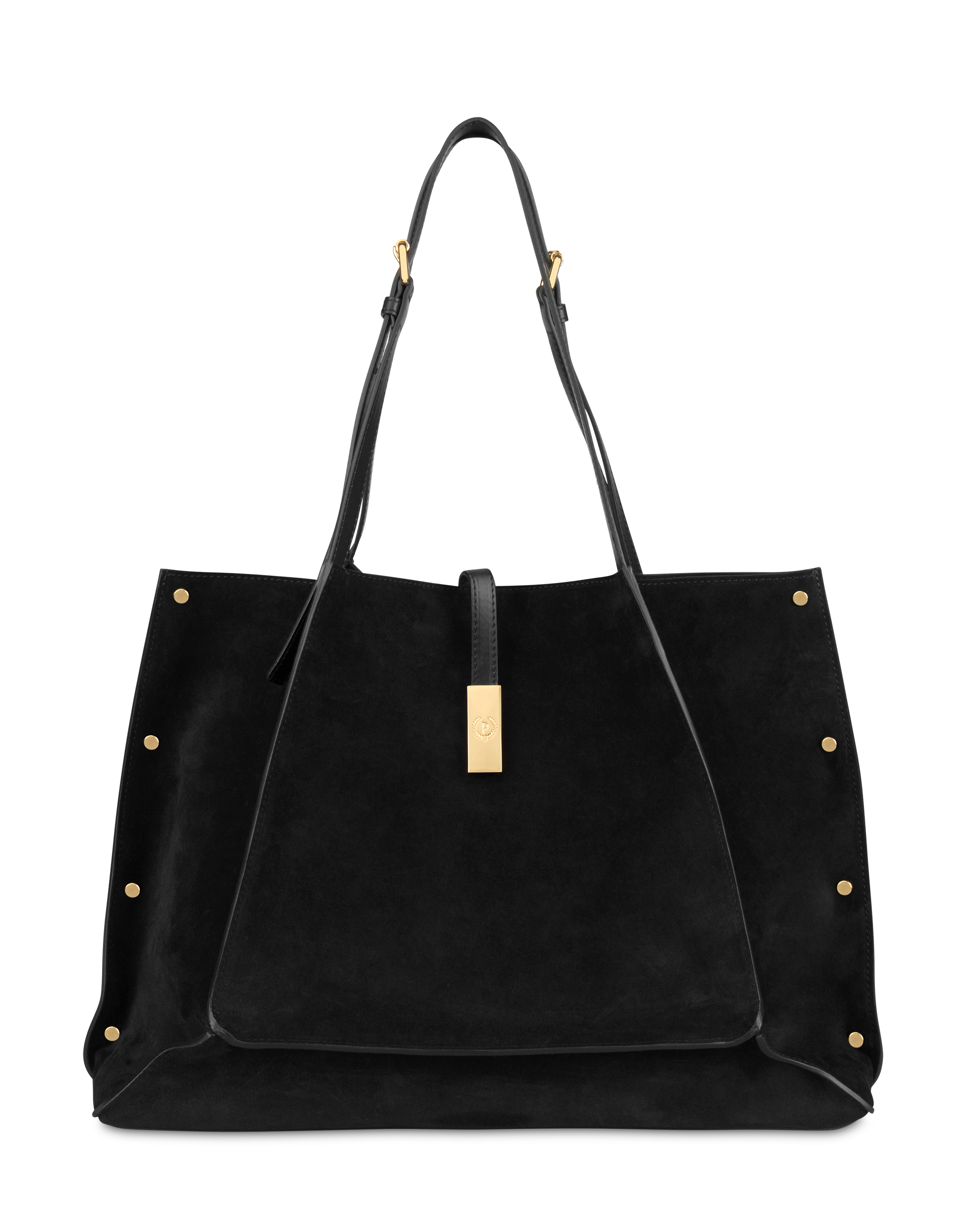 One of the collection's most timeless icons, the Austin Double Handle Bag combines character and sophistication. Made of split leather with smooth calfskin inserts, it stands out for its adjustable handles with metal buckle and the strap closure with magnet. Simple yet sophisticated, it has a lined interior with an internal pocket and a leather logoed label. The decorative studs and the plaque with the engraved 'P laurel' logo add a distinctive flair. Versatile carrying styles, either by hand or over the shoulder. Gold-plated finishes.