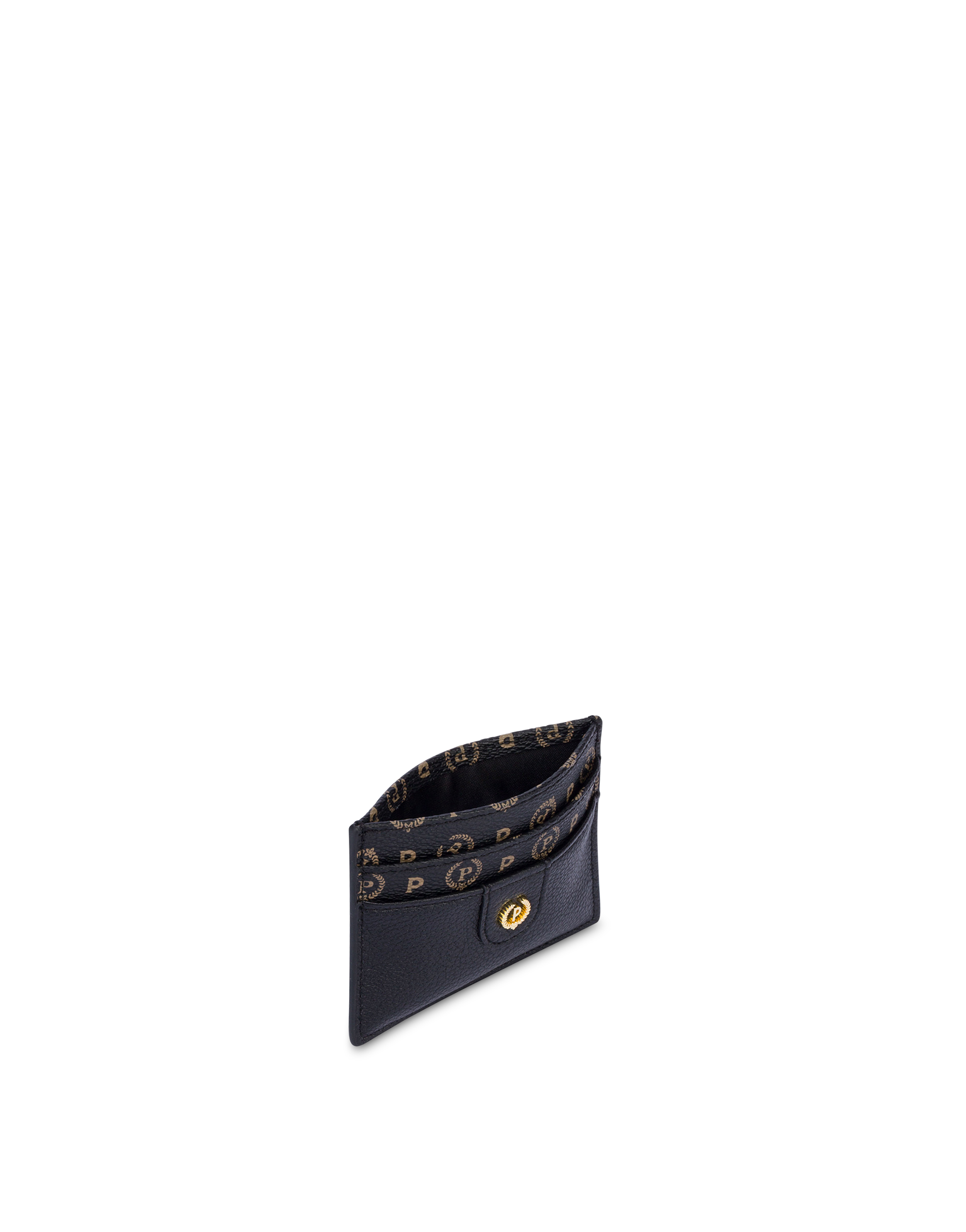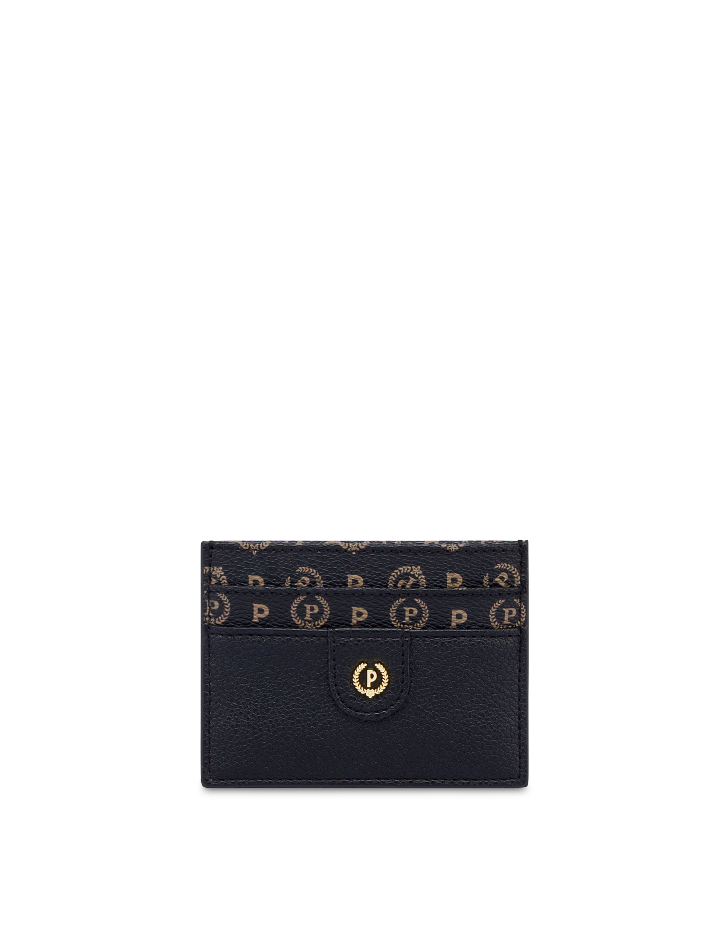'Compact, elegant, and functional: the Pollini card holder is the ideal accessory to store your essentials in style. It is embellished with a horizontal band with the 'Heritage' motif and the iconic gold metal 'P' laurel logo on the front. Equipped with 4 card slots and a central compartment, it guarantees practicality and organization in a slim and refined format, perfect for any bag or pocket.'