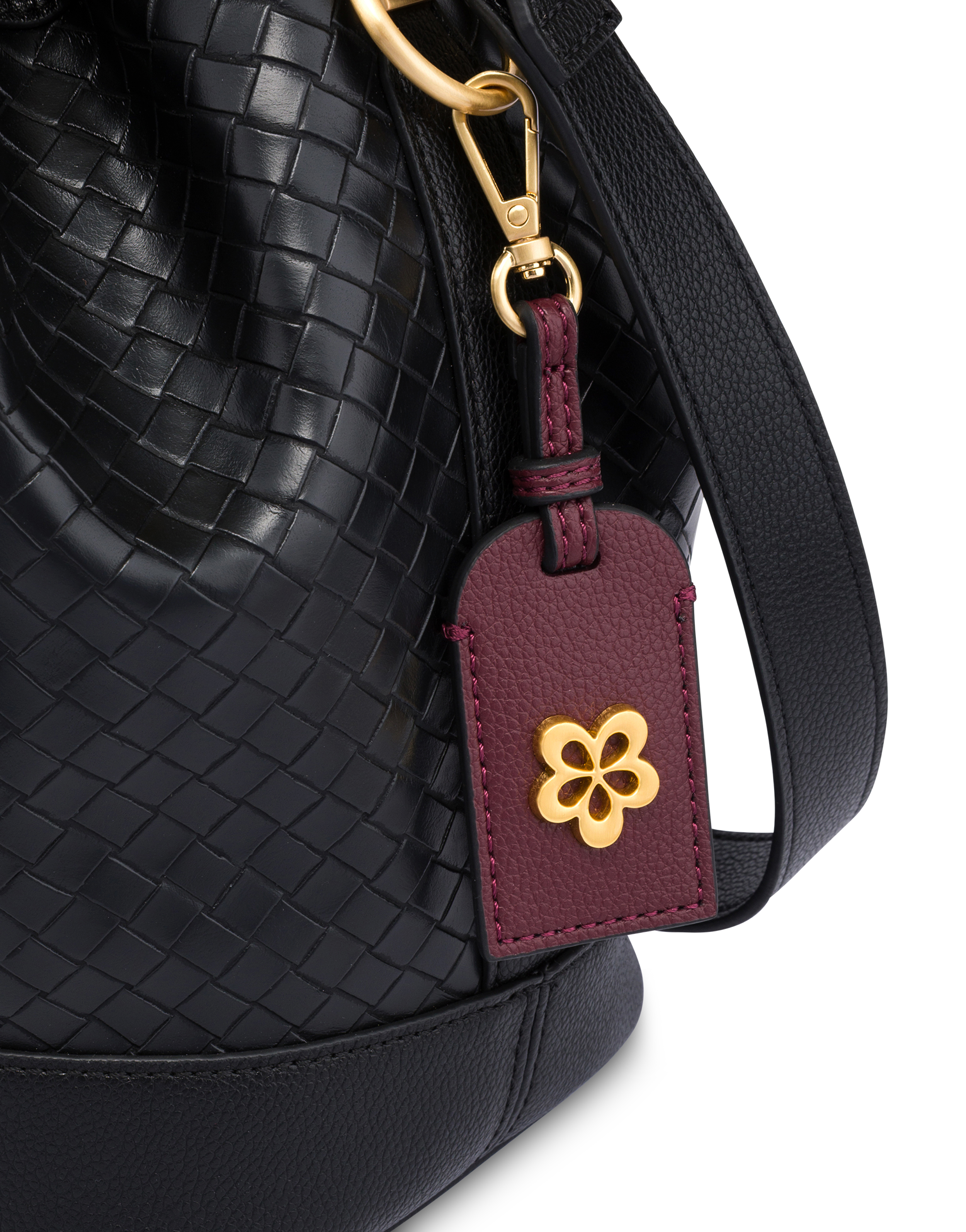 With a refined and contemporary style, this woven-look model stands out for its meticulous details and sophisticated silhouette, perfect for enhancing any look. The design is enriched by a metal logo on the front and brushed gold-plated finishes, while the drawstring closure and contrasting charm add a distinctive and original flair.