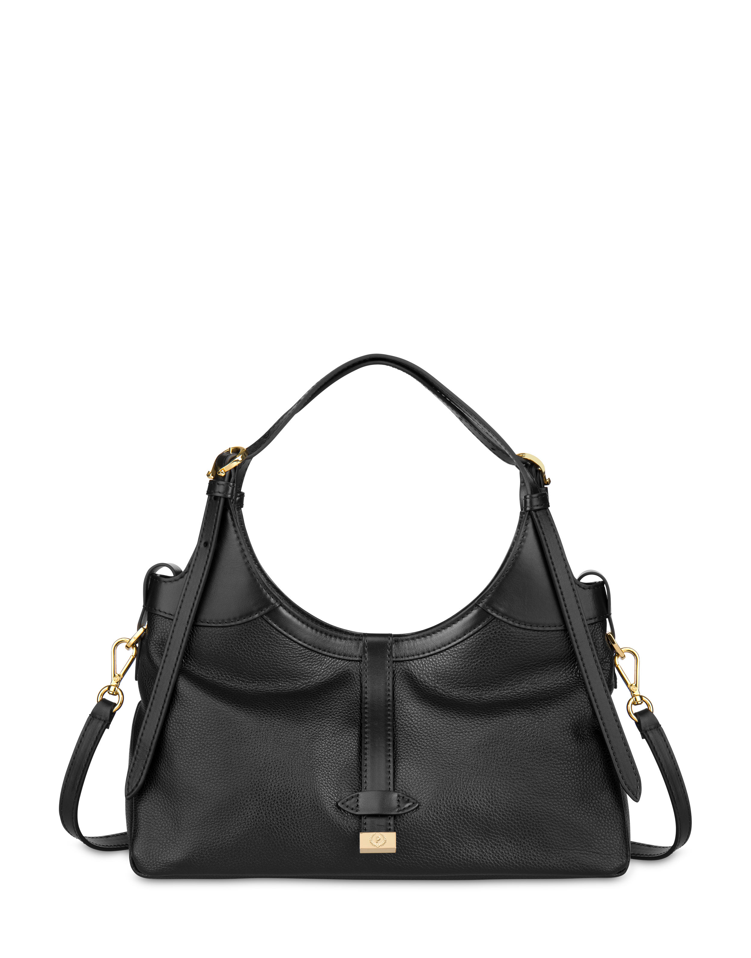 Compact in size, yet bold in style. The small version of the Mia Double Handle Bag is made of grained calfskin with smooth leather inserts and embellished with gold details. The adjustable double handle ensures versatile portability, while the lined interior features a zip pocket and a leather logo label. The metal tip with engraved 'P-Alloro' logo completes the design with an iconic and refined accent.