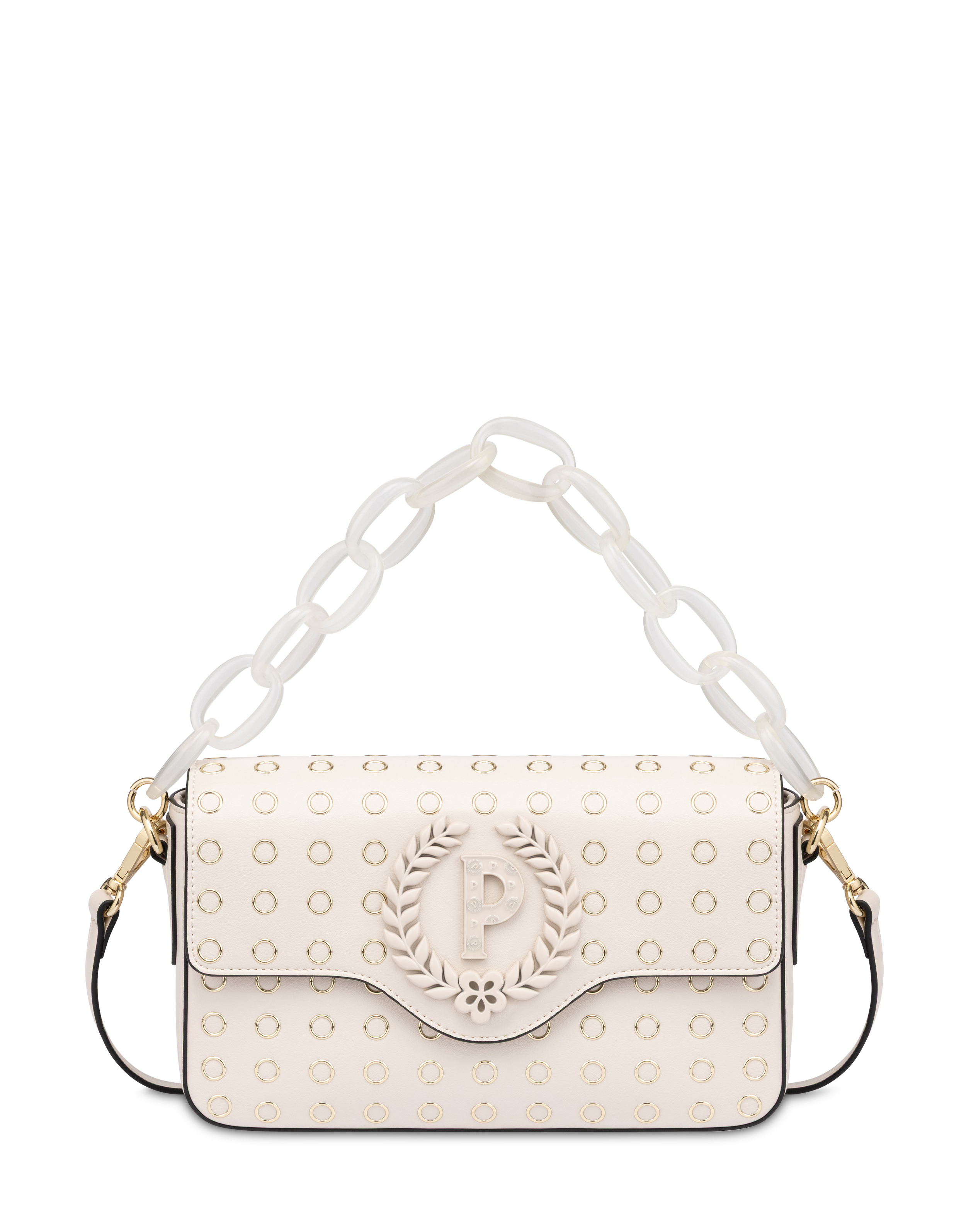 La Crossbody Bag Candy di Pollini è un accessorio dal carattere deciso, realizzata in Plain PU, si distingue per l’applicazione di occhielli metallici all over che donano un tocco di grinta e personalità. Il vero protagonista è il maxi logo 'P Alloro' metallico, smaltato in tinta alla borsa e impreziosito dal pattern Heritage a rilievo. La maxi catena decorativa aggiunge un elemento fashion e distintivo, mentre la chiusura magnetica, la tasca interna con zip e la tracolla amovibile garantiscono praticità e versatilità.
