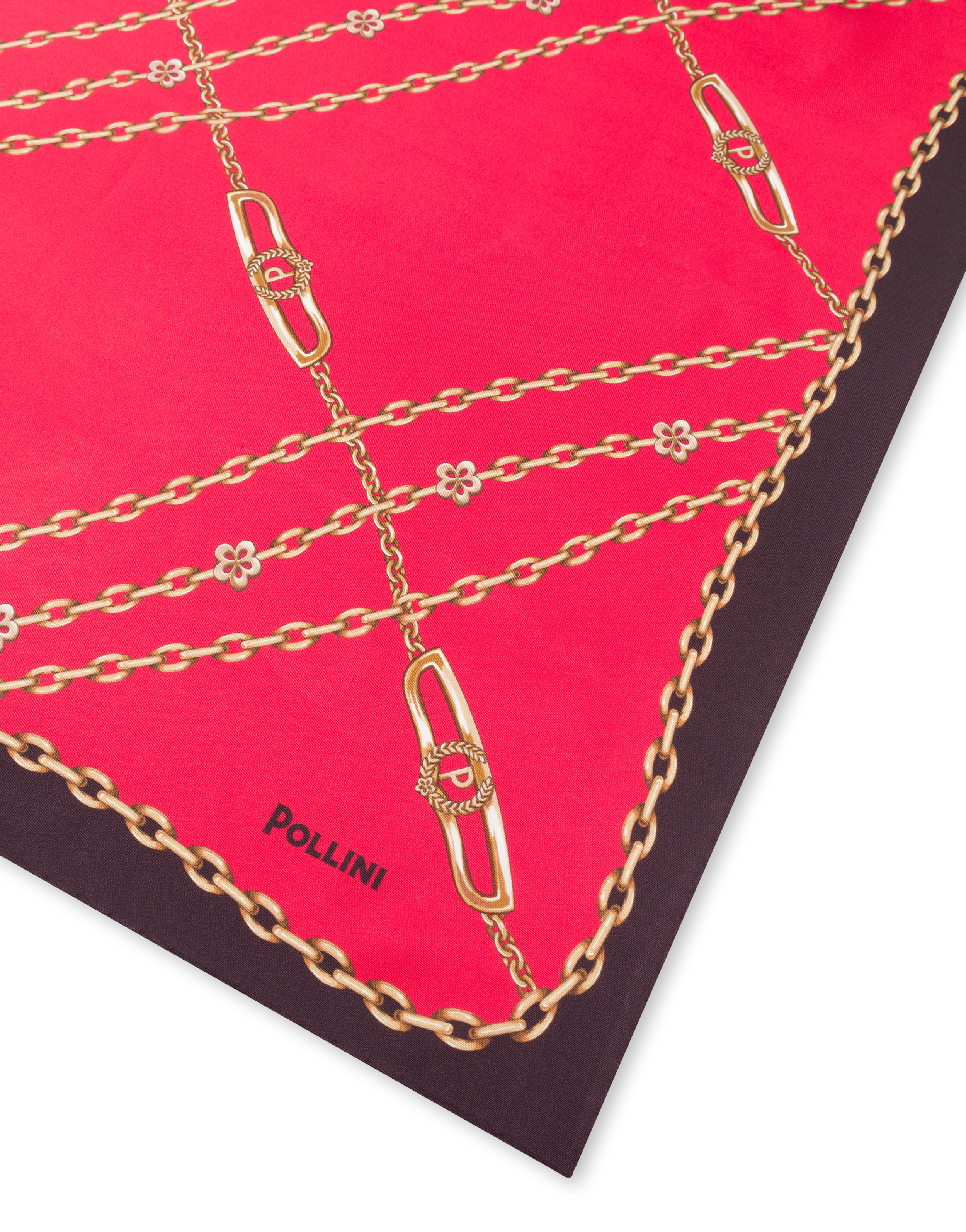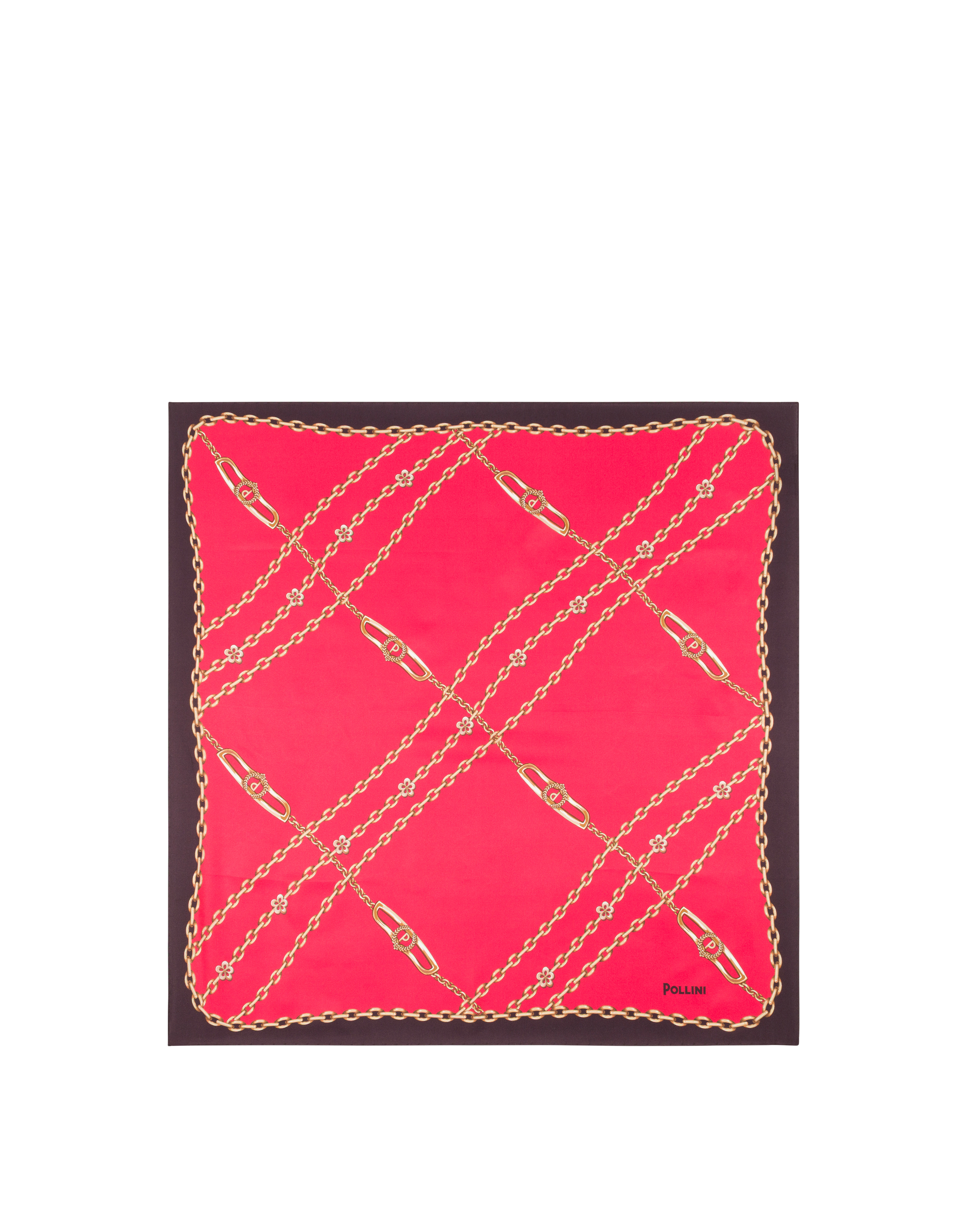 Foulard in twill di seta con motivo a rete formato da catene dorate. Questo tipo di decorazione richiama un'estetica classica e ricercata.