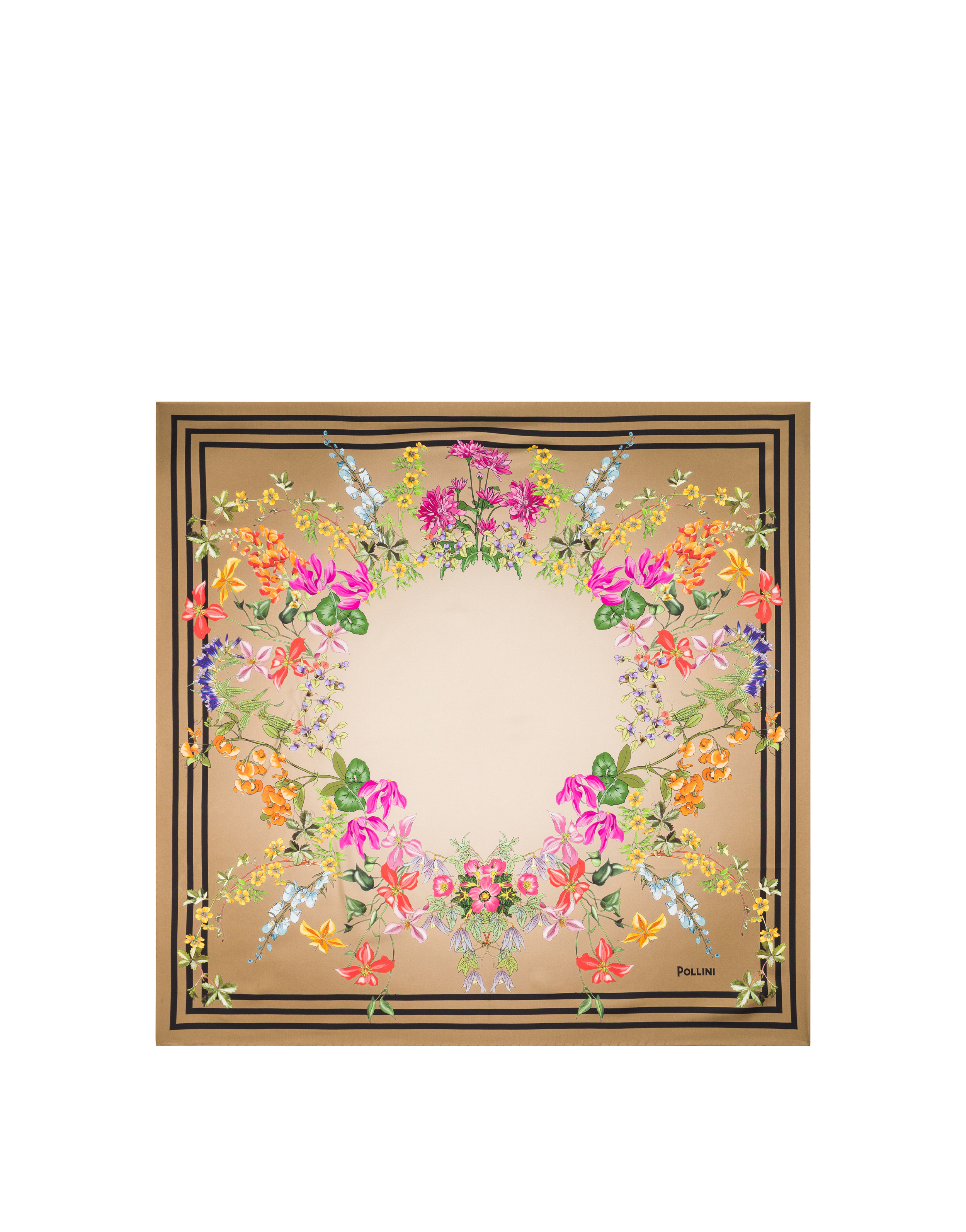 Foulard in twill di seta con stampa pittorica a fiori circolare. La tripla cornice a contrasto crea un dettaglio geometrico.