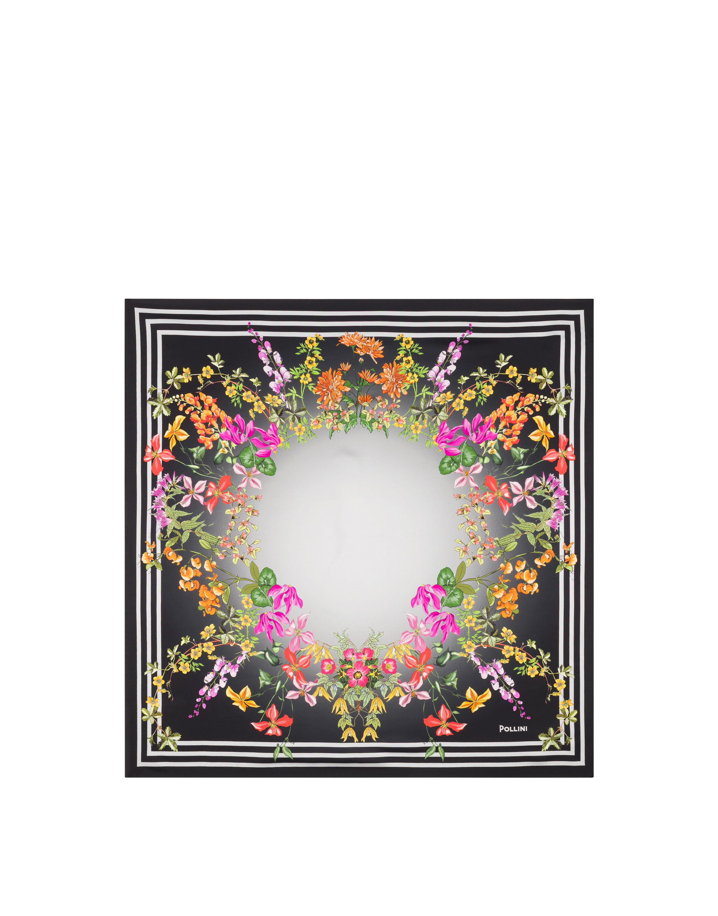 Foulard in twill di seta con stampa pittorica a fiori circolare. La tripla cornice a contrasto crea un dettaglio geometrico.