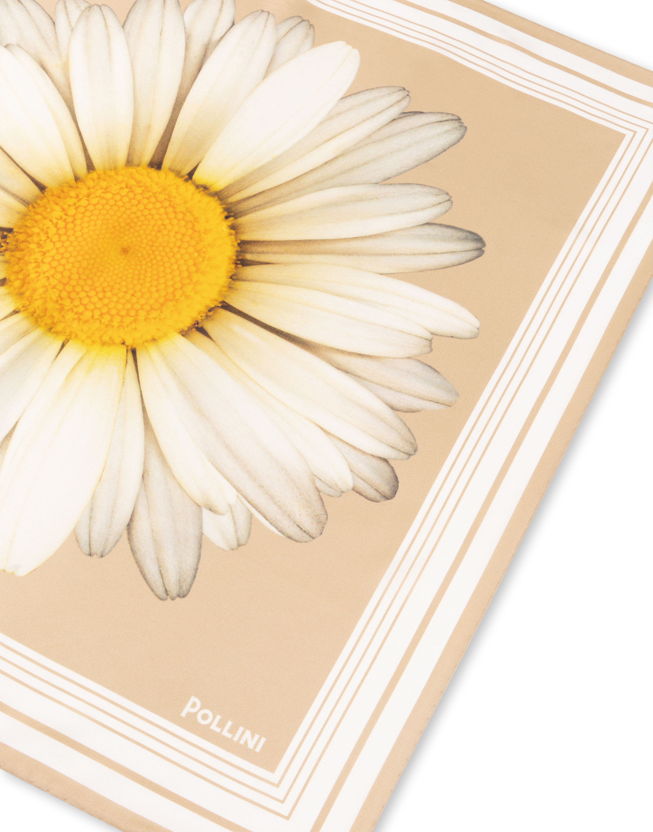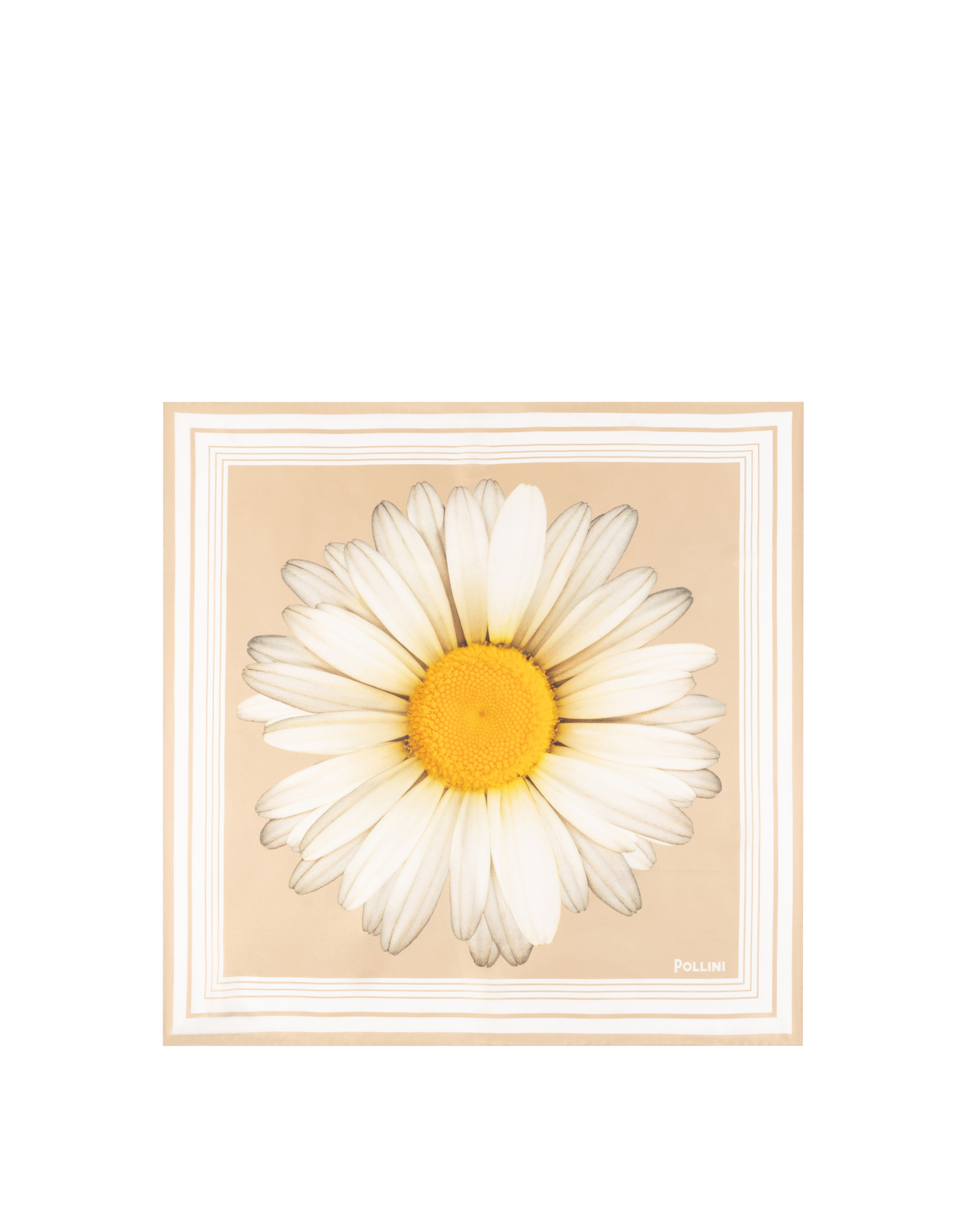 Foulard in twill di seta stampato con maxy margherita sul centro, su fondo monocolore. Una cornice monocolore abbraccia il fiore e nella parte laterale in basso troviamo il logo Pollini.