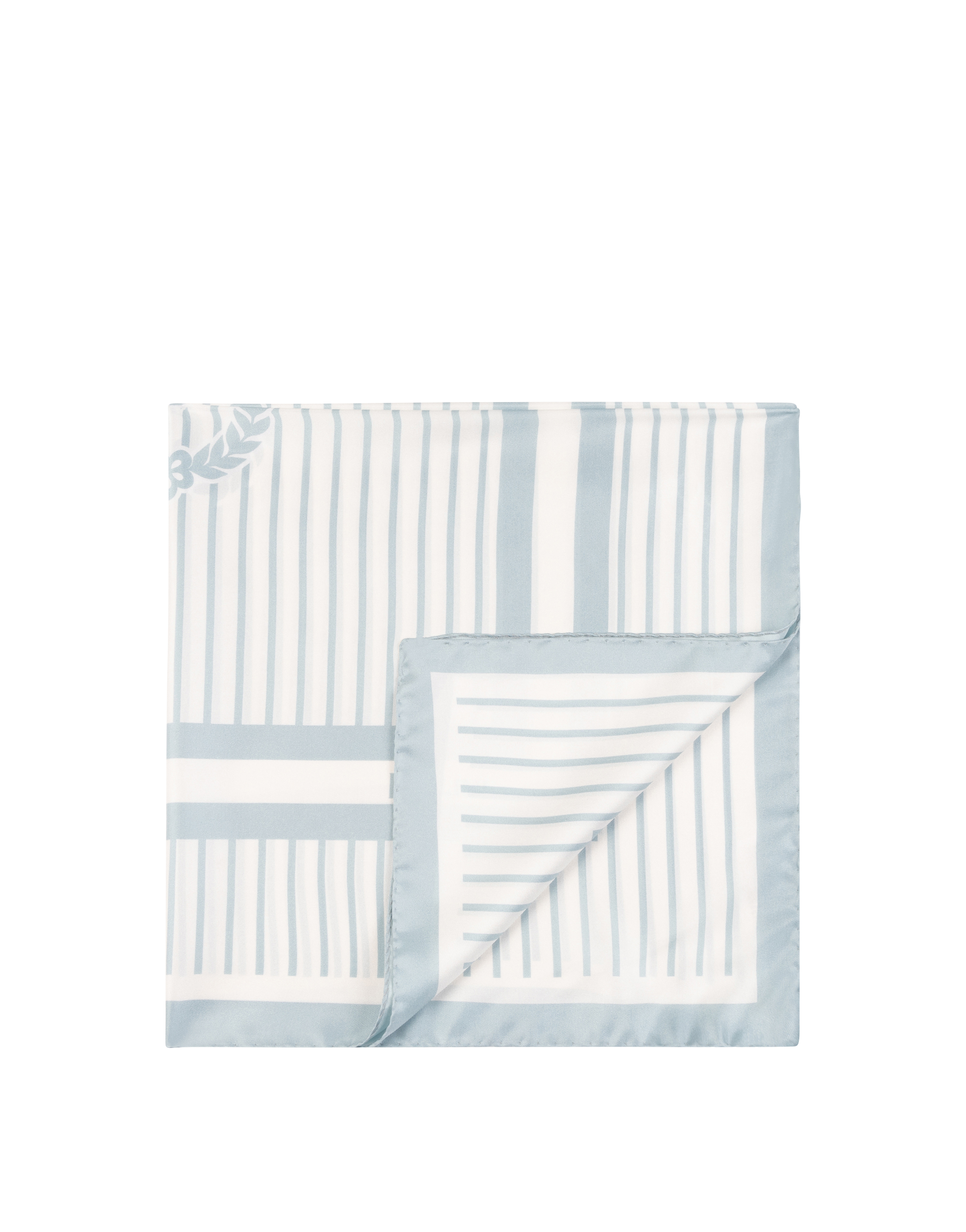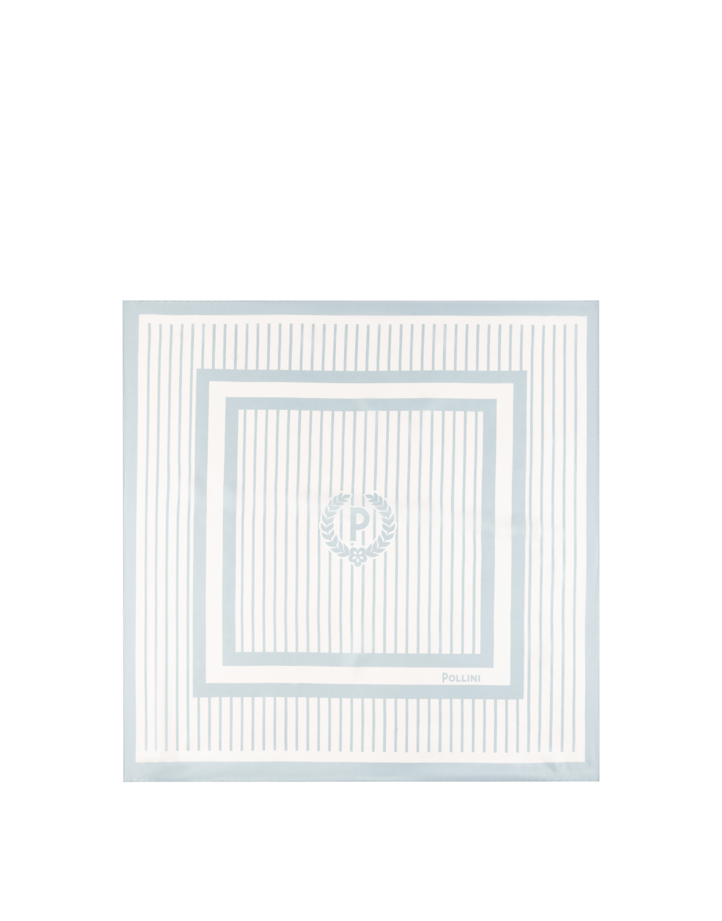 Foulard in twill di seta stampato con elementi quadrati su base rigata. Lo stile decorativo richiama i motivi classici del Brand, con il logo Pollini nella parta centrale, e un gioco di colori a contrasto.