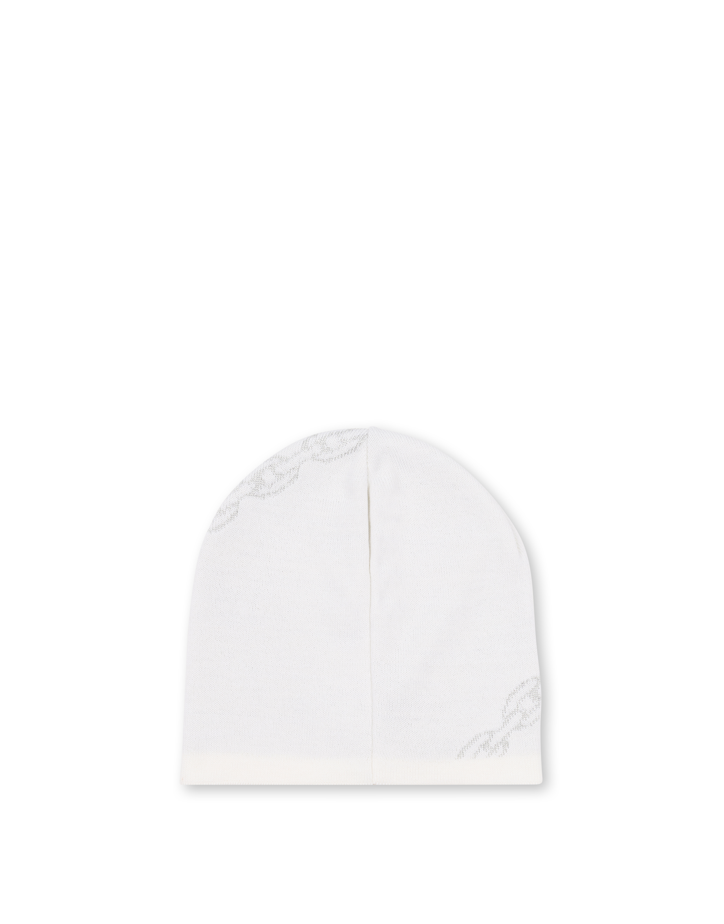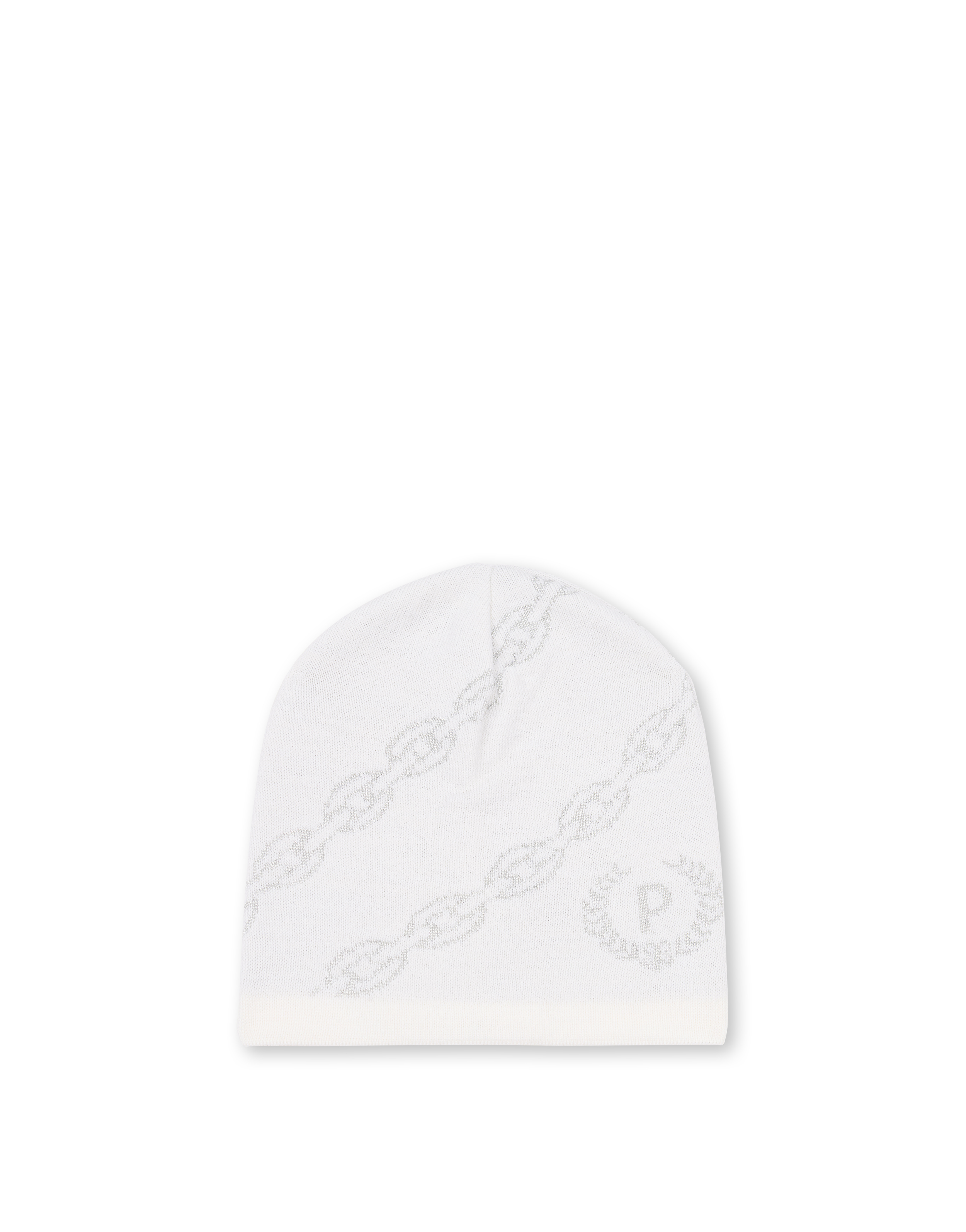 Cappello in misto lana con stampa catene che richiama la metalleria della pelletteria Pollini. Il macro logo sul bordo personalizza la stampa.