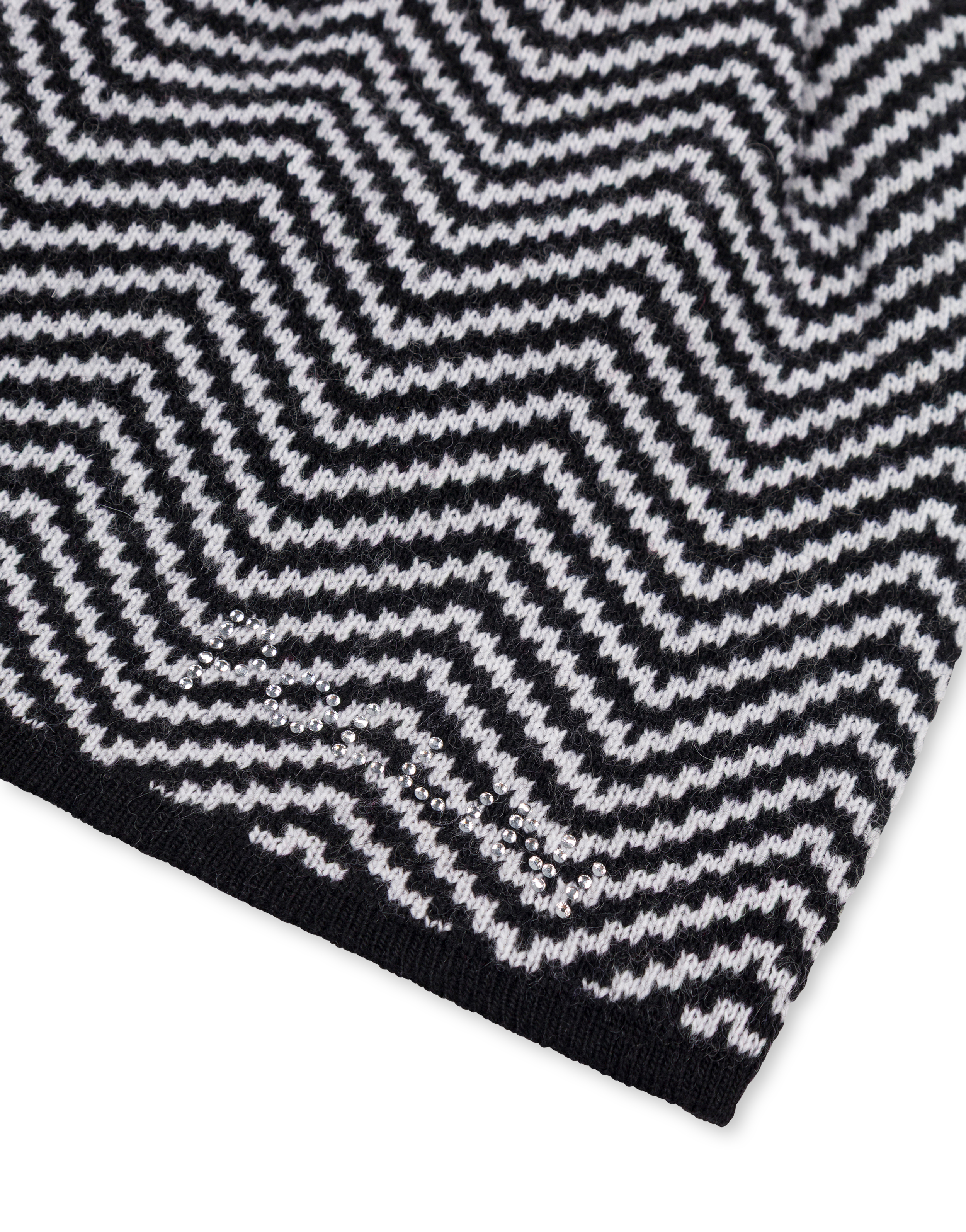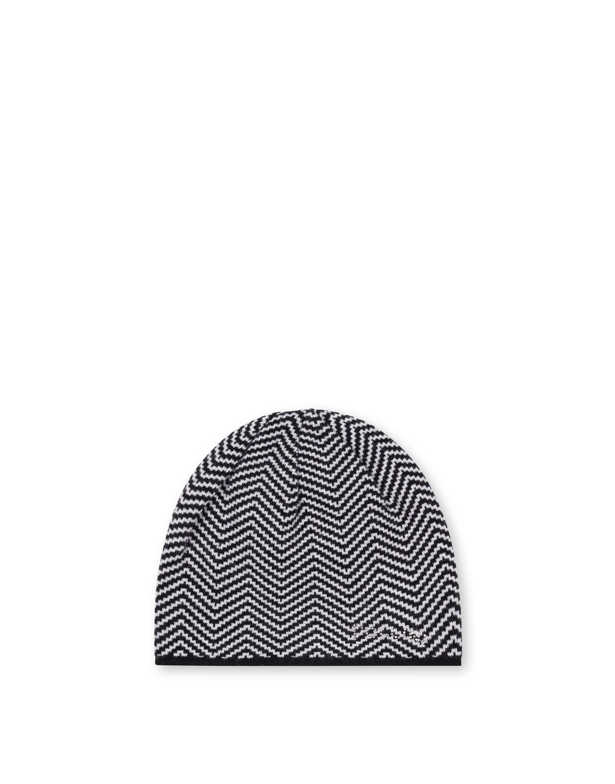 Cappello in misto lana tinta unita con bordo unito. La stampa richiama i dettagli iconici della pelletteria Pollini. Il logo lettering formato da brillantini personalizza la stampa.
