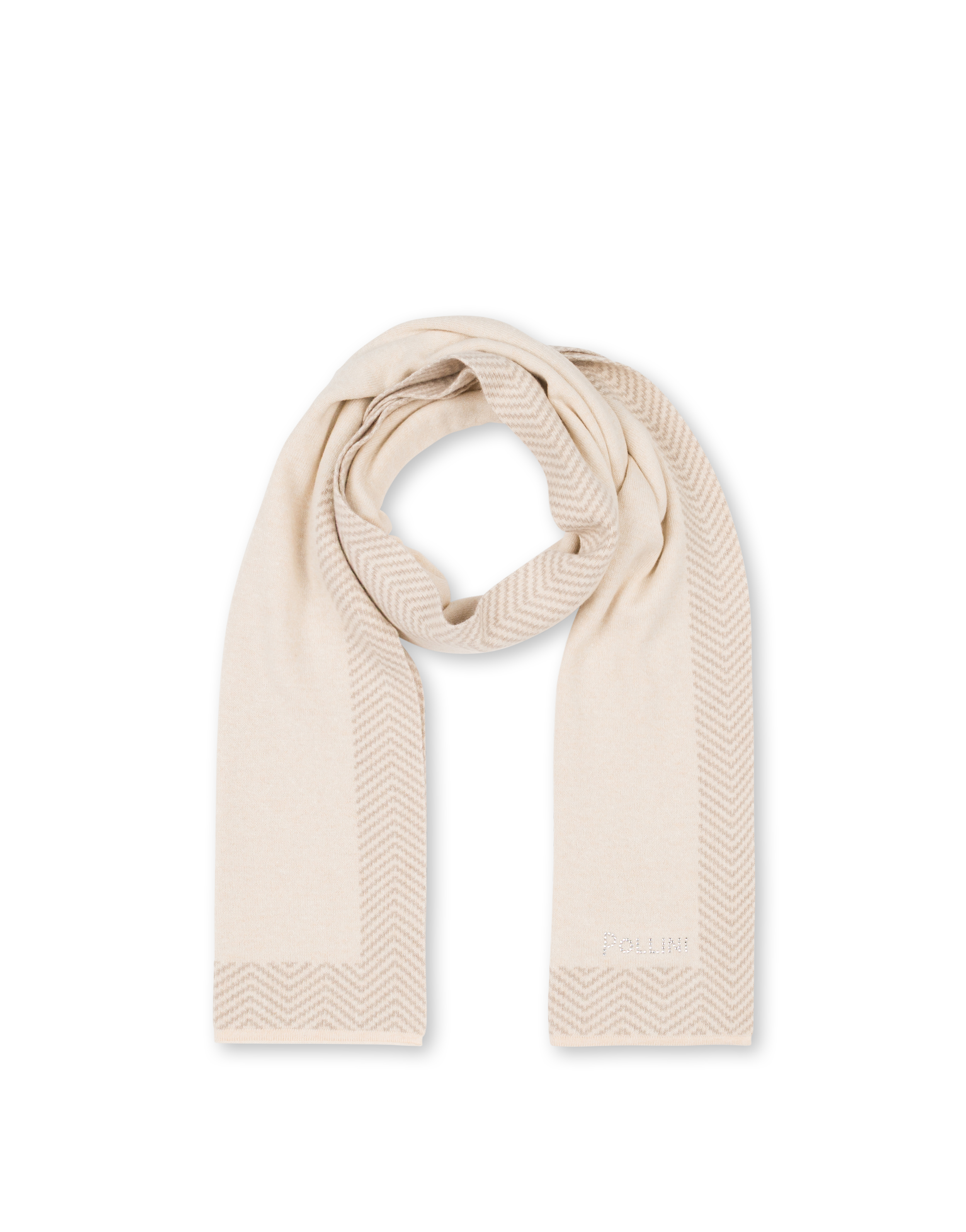 Sciarpa in misto lana tinta unita con bordi stampa chevron a contrasto. La stampa richiama i dettagli iconici della pelletteria Pollini. Il logo lettering formato da brillantini personalizza la stampa.